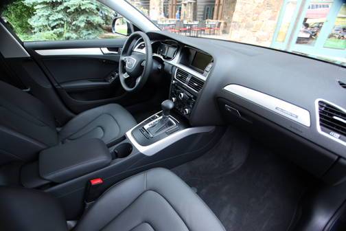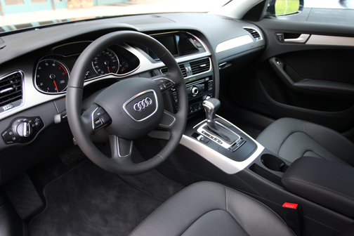 | De abajo hacia arriba, se comienza con aros de 18 pulgadas en el modelo Premium, lámparas delanteras de bi-xenón, y las luces automáticas de circulación diurna basadas en LEDs, modalidad que estrenó Audi en la edición anterior del A4 —ahora son de nueva generación—, radio satelital XM y sunroof panorámico. |