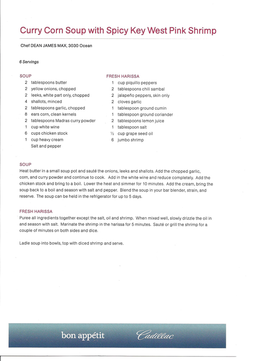 | Johnny V presentó el Camarón estilo BBQ de Cayo Hueso junto con la Ensalada de patatas y langosta y salsa de frutas y de mango. James Maxx ofreció la sopa de maíz con curry con Salmón Rosado picante estilo Cayo Hueso, que resultó la agraciada por el jurado (por si el lector quiere practicar en casa, ambas recetas se ofrecen en inglés al final de este reportaje). |