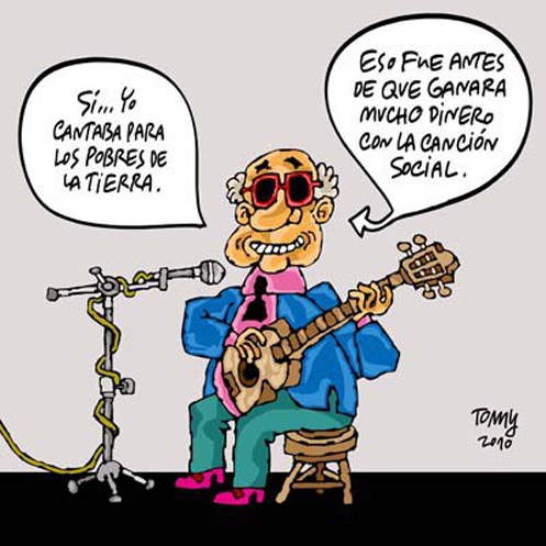 Ante tales argumentos, preferí ponerlo a discutir con sus propios patrocinadores, mas no aceptó el reto. Le recordé que la prensa oficial cubana, no la de Miami, acababa de publicar una caricatura en la que se ve a un trovador, guitarra en mano, acusado de hacerse rico con la canción social, más bien acusado de atreverse a criticar la revolución después de hacerse rico con la canción social. Fue a todas luces el mecanismo que el régimen escogió para advertir a él o a Pablo Milanés, que no eran inmunes. Se veía muy claramente. Les estaban enseñando los dientes.