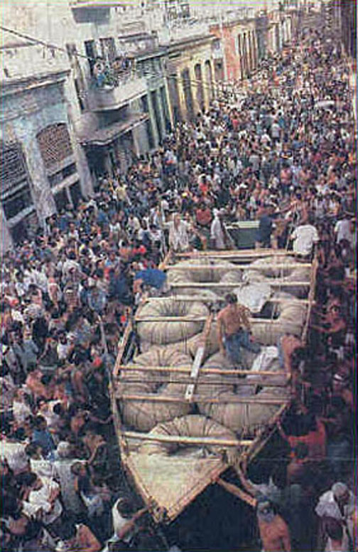 Castro accede a la propuesta y convoca al pueblo a la Plaza de la Revolución el 26 de julio, para entonces en su ciento y tantos aniversario. Una vez allí, en la tribuna, el "máximo líder" en su perorata anual, cita otra vez que el país bajo el eterno acoso del Imperialismo y su bloqueo criminal contra Cuba, más recio ahora que nunca antes, ante una inminente carencia sin igual de alimentos, en el afán de salvar a la nación y a la Revolución, los cubanos para subsistir, igualando las nuevas magras raciones de comida deben enfrentar un sacrificio supremo: que uno de cada tres se ahorque.