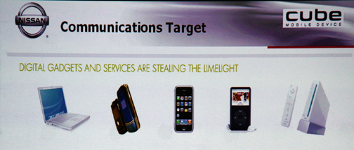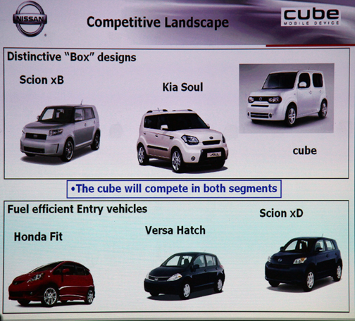 Su objetivo es sumarse al creciente segmento de los crossovers —cuya tendencia perspectiva es ascendente según los analistas—, y también quiere inscribirse en la lista de los económicos —se pronostica que el precio de la gasolina volverá a subir eventualmente—. Además el Cube, por antonomasia, debe participar en un segmento emergente: el de los jóvenes prospectos. |