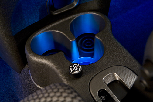 El interior muestra un detalle curioso: emplea a modo de antagonismo del aspecto cúbico del vehículo varios diseños tipo gota de agua que cae en superficie líquida que genera anillos concéntricos, lo que tiene su mejor momento en torno a la lámpara central sobre el techo y en unos pequeños enganches en los que sobre todo los ocupantes del bello sexo podrán colgar de ellos carteras o bolsas con mercancías. Estas protuberancias pueden ser extraídas a presión de sus emplazamientos originales e insertadas en otros para más flexibilidad y conveniencia. |