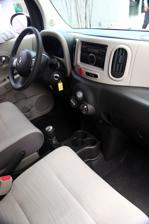 Probamos primero la edición simple con transmisión manual y nos complació porque hallamos en ella el verdadero nudo del vehículo. Aún la versión más siemple del Cube incluye acceso remoto sin llave, y ventanillas, pestillos y retrovisores laterales eléctricos. Esto es importante: Para un vehículo que pertenece al nicho de los económicos, el Cube no ignora amenidades de auto de un nivel un poco más alto, y sin embargo su precio de etiqueta vuela bajo. Este modelo trae controles manuales de botones redondos para el climatizador de aire —digitales y apoyados en pulsadores de repetición en los cortes superiores— y la organización cromática dentro es más plana.