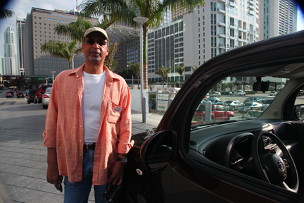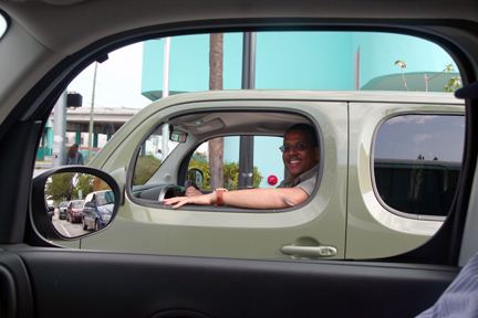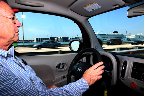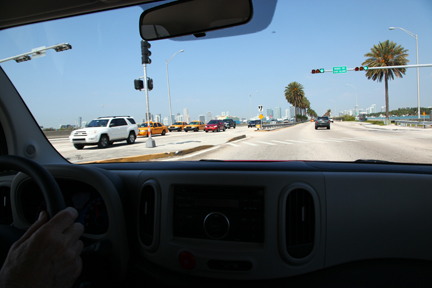 | Frank Aukofer, mi compañero de prueba, conduce por el MacArthrur Causeway. El Cube nos encantó a ambos. |
