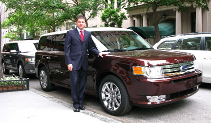 | El jovial Alvaro Cabal, de Ford Motor Co., frente al Gramercy Park Hotel en New York, satisfecho de la buena marcha del evento de presentación y de los resultados logrados en el Flex. |