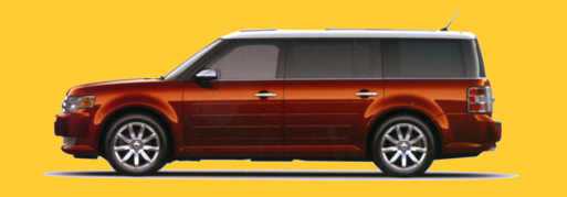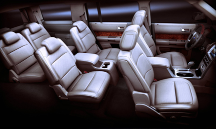 El Ford Flex se ofrece en tres modelos, el SE, el SEL y el Limited. A las facilidades comunes a los tres vehículos como ventanillas, asientos, pestillos y retrovisores eléctricos, el Limited en el pináculo de la lista, añade entre otros elementos finísima vestidura de piel perforada, una nevera que alberga hasta dos botellas de 20 onzas entre las sillas de la segunda bancada —¿este es un Maybach o un Ford?—, el volante con incrustación de madera y el conjunto de claraboyas Multi panel Vista Roof™ —también opcional en el modelo SEL—. El Limited viene con aros pulidos de 19" y, opcional 90 días después de su lanzamiento, de 20", cromados. Pero el SE y el SEL también están muy bien dotados. |