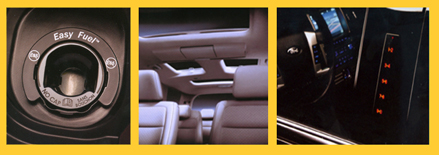 Junto con la nueva F-150, el Flex es el otro carro de Ford que ofrece el EasyFuel Capless Refueling System, o sea, boca de tanque de gasolina sin tapa, que obtura la presión de la pistola de la bomba de gasolina y "cicatriza" por sí sola gracias a un avanzado sistema de ventosas. |
