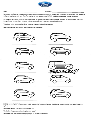 Sirius es el proveedor de radio satelital de Ford. En el evento, junto con Ford, el servidor nos extendió un test cuya recompensa al o los participantes de nota sobresaliente sería un receptor satelital de Sirius®. El examen consistía en conseguir la información de ruta que mencioné antes e identificar alrededor de una decena de siluetas de SUV's, crossovers y minivans de competidores —domésticos e importados—, entre los que se incluía el perfil del Flex... ¡que fue el único que los periodistas identificamos al vuelo! |