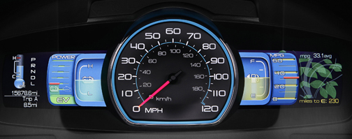 Tras abrir la puerta y sentarse al volante, la pizarra le da una bella bienvenida al conductor con una imagen a ambos lados del velocímetro tipo pantalla de computadora Apple-Mac con un verde paisaje y el emblema del óvalo azul de la firma que subraya su vocación ecológica. En realidad se trata de una pantalla de LCD con gráficas y animación, y la curiosidad de exhibir un conjunto de hojas vegetales que se hacen más exuberantes y tupidas en tanto usted conduzca mas “verdemente”… cool, ha? Este sistema se llama SmartGauge.