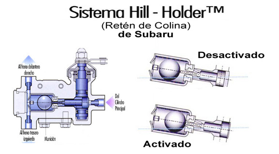 En mecánica, las soluciones más eficientes son las mas elementales. Así es este sistema, que trabaja el frenado a través de una válvula controlada por una munición que se desplaza dentro de un cilindro. Con un comportamiento en parte semejante a un nivel burbuja, esta munición se recuesta por gravedad a un extremo u otro del vehículo abriendo o cerrando la válvula que controla los frenos según el vehículo se deslaza horizontalmente o se frena en un plano inclinado. Manteniendo el pedal de clutch o embrague oprimido, los frenos permanecen activos, de manera que puede sacarse el pie derecho del pedal de freno y comenzar a acelerar sin que el vehículo "se caiga" hacia atrás. Entonces se puede retirar con tranquilidad el pie del pedal de clutch. Un arranque en colina seguro... y a prueba de tontos. |