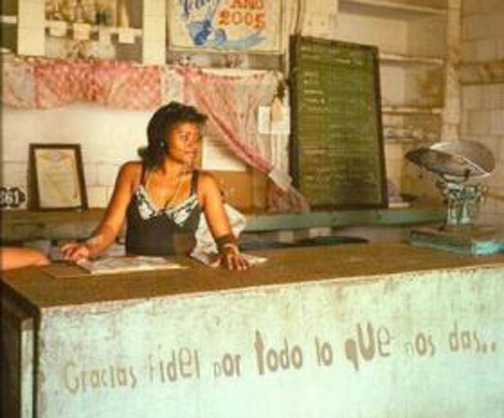 | Obsérvese en esta foto de baja resolución el rótulo de GRACIAS FIDEL POR TODO LO QUE NOS DAS, al frtente del mostrador, lo cual es una ironía como para enmarcar. |
