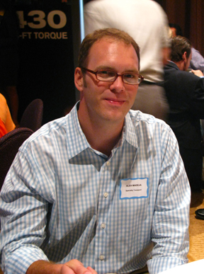 | Ariel García Linares, vocero de Hyundai para los medios hispanos. En segundo plano, Terence Keon, de Automundo TV. En la foto a la derecha, Arturo Duran, de Mundomotor —izq.— y Dick Kelly, de Toyota. |