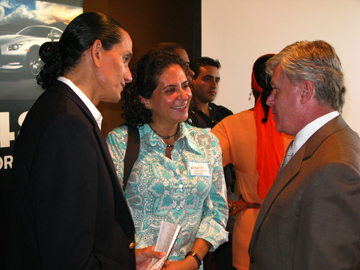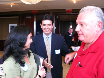 | Izq: Martha Lucía Gómez, de Megazines Group, y Angelo Serrato, de Prestige Auto Specialists —al centro— con José Delfino, del website de Automundo. Encima, Dick Kelly conversa con Bill Adam, de CBS Motorsports y tesorero de SAMA. |
