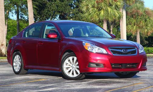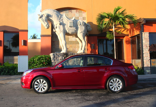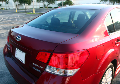 Lo primero que salta a la vista es que ha sido sobredimensionado, lo que beneficia sobre todo al espacio interior, ahora verdaderamente roomy, ya que antes no era un coche de marcadas amplitudes. El cuerpo enseguida percibe estas ampliaciones cuando estamos dentro, porque el Legacy ahora tiene más capacidad para las piernas y en lo que inglés se conoce como shoulder y headroom. Era misión obligada: Las más recientes ediciones del Honda Accord y del Mazda 6 crecieron, de modo que el nuevo Legacy tenía que ganar 3.3 pulgadas en alto —esto se nota enseguida—, 3.5 en ancho —lo cual es bastante— y 3.2 de espacio entre ejes por encima del modelo 2009. Sin embargo, en general solo creció 1.4 pulgadas, por eso se le ve ahora menos estilizado que el modelo precedente, para un look más chunky. La distancia total entre ejes finalmente es de 108.3 pulgadas y el carro tiene una eslora de 186.4. En cuanto a peso, aumentó 65 libras y esto no es para ponerlo a dieta porque no compromete su ligereza ni su maniobrabilidad. |