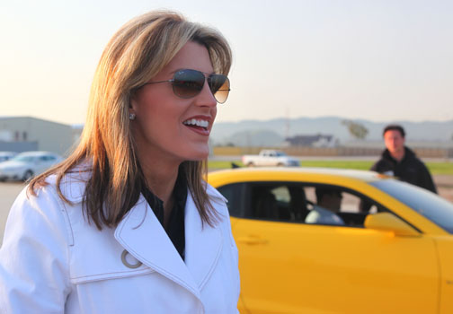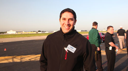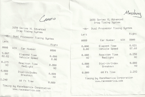 | Pepe Forte, conductor del programa radial AUTOMANIA de UNIVISION RADIO, en Camarillo Airport donde hicimos otro test comparativo con el Camaro. Debajo, el score del periodista en uno y otro auto. La velocidad máxima obtenida en un octavo de milla fue al volante del Mustang, 87mph: |