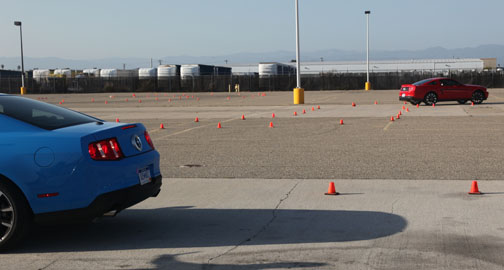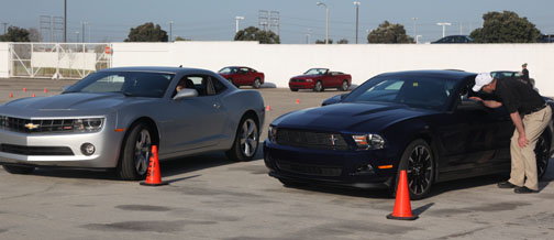 Al final del primer día terminamos haciendo slalom en una explanada habilitada al efecto. Acaso por el cansancio del viaje o por la intimidación que me causó hacer la prueba junto a un experto como Tom Williamson —quien registró los mejores tiempos—, I really butchered it… En realidad, jamás divisé los pequeños conos naranja que contorneaban el trazado en la última sección de éste, por lo que, naturalmente, nunca pude obtener un score. A pesar de esto, en las ¾ partes que del test fui capaz de hacer, se revelaron las capacidades del Mustang sobre el Camaro, contra el cual medimos al nuevo pony de Ford. Del Camaro sobre el Mustang sólo prefiero ahora como resultado de aquel examen, la palanca de cambios —aquí los vehículos de prueba fueron manuales—, que tiene un poco más de altura —well, por lo menos así se siente—, y su empuñadura envuelta en cuero para mejor agarre, aunque cosméticamente menos deportiva que la brillante y lisa tipo metal del Mustang. Además, por su baja línea del techo la visibilidad en el Camaro al conducirlo como hicimos allí usando un casco de protección, se empobrece agudamente. |