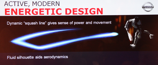 En cuanto a styling, su perfil nace de la llamada así por Nissan squash line, la dinámica trayectoria de una pelota del viril deporte cuando le pega con la raqueta el jugador y rebota en la pared. |