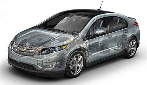 Es cierto que en beneficio de lo que dijo Obama, algunos autos en particular justo en la misma noche en que expresó su disparate ostentan eficiencias asombrosas, como el Ford Fusion híbrido, que hace 40 MPG, o el Chevrolet Volt (imagen debajo), capaz de andar 38 millas eléctricamente antes que arranque su motor de gasolina tan sólo para recargar la batería. |