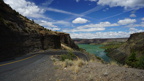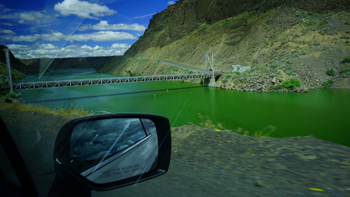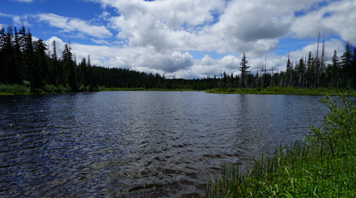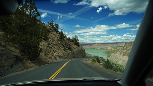 Entusiasmados por la prueba, perdimos la cuenta del tiempo y la distancia conduciendo así, pero creemos que fue sobre 40 minutos —o acaso más—, a veces conduciendo sobre 45 MPH (42 es el número más alto que recordamos en un fugaz atisbo al velocímetro), y en otros instantes por debajo de 5, porque así lo exigían las condiciones de la ruta. Además, fuimos subiendo hasta una parada para el almuerzo al pie de un sereno lago. |