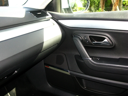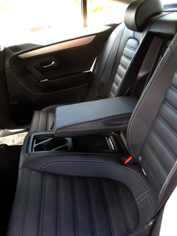 Fiel al concepto de cupé (y justamente lo que CC significa es Concept Coupe), el CC tiene sólo dos asientos en la bancada trasera, no tres. Entre estos dos asientos se ubica un pequeño compartimiento y dos portavasos que se ocultan con una tapa deslizante. Y también se puede desplegar sobre ella un amplio brazo abatible que se alberga en la espalda del asiento trasero. Pero si en algo se aparta el CC del más genuino aliento del cupé es en el espacio para las piernas. La butaca delantera del conductor, desplazable eléctricamente, corre hacia atrás muchísimo, de manera que permite ponerse al volante con toda comodidad a los llamados six footers, es decir, personas que miden 6 pies o más de estatura, y aún así no comprime las piernas del ocupante trasero. Pero, ¡oh!, lo que sobra para las piernas, falta para la cabeza: Dusty Springfield la cantante inglesa de los años 60 no habría podido conducir el CC con los peinados altos de aquella época, ni este periodista, que gusta de lo sombreros de cowboy —que por cierto, no le van nada bien al CC— pudo usar uno en la prueba a este VW. En realidad, si no fuese porque el auto es cautivadoramente bello y de asientos muy cómodos, sería imposible ignorar el hecho de que el CC dentro es un poco opresivo y que, como el Mercedes CLS, se le percibe pequeño interiormente. Esta sensación es acentuada por la ya compresión de las ventanillas y del cristal trasero. |