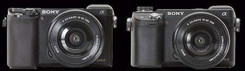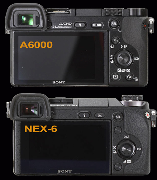 El cuerpo de la A6000 es ligeramente mayor comparado con la NEX-6 (en la foto inmediatamente debajo, la A6000 es la que aparece a la izquierda del lector). Vista de frente, la 6000 es sutilmente más alta, y se puede identificar al vuelo por un detalle: La rueda de comando de exposiciones de la NEX-6 (a la derecha), sobresale, mientas que en la A6000, queda a nivel del "techo" de la cámara.