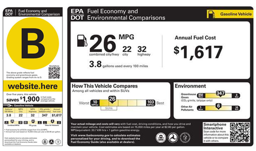 El nuevo monroney agrega una nueva medición a la que se ha opuesto la NADA (o la Asociación Nacional Americana de Concesionarios), que consiste en una escala en letras de la A a la D (la D es la peor, y todas llevan gradación de más o menos) para los niveles de emisión y de rendimiento comparados con otros vehículos semejantes. Así, por ejemplo, un Ford Fusion Híbrido se llevaría una A comparado con un Chevrolet Corvette, que se llevaría una D.