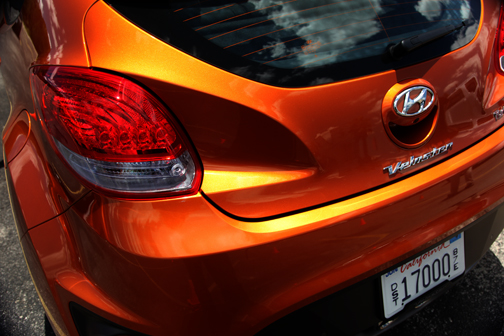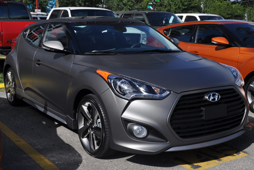 ¿Cómo se identifica visualmentre el Veloster Turbo del Veloster regular? En primer lugar, el Veloster Turbo se ofrece ahora en el color titanio mate que tan de moda está. Pero básicamente por su grill sobredimensionado de hexágono achatado (negro), rims de distinta configuración y, por detrás, los caños de escape redondos como los neblineros al frente, y dos grandes reflectores rojos detrás, de igual geometría. |